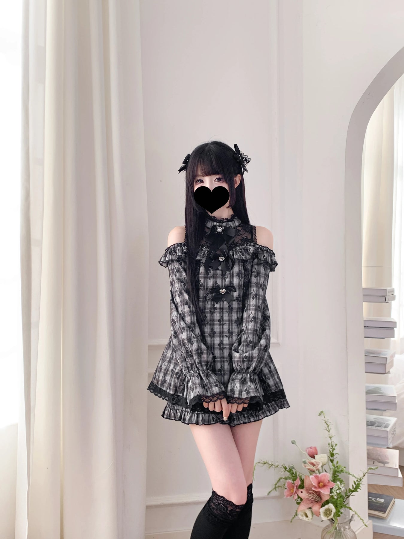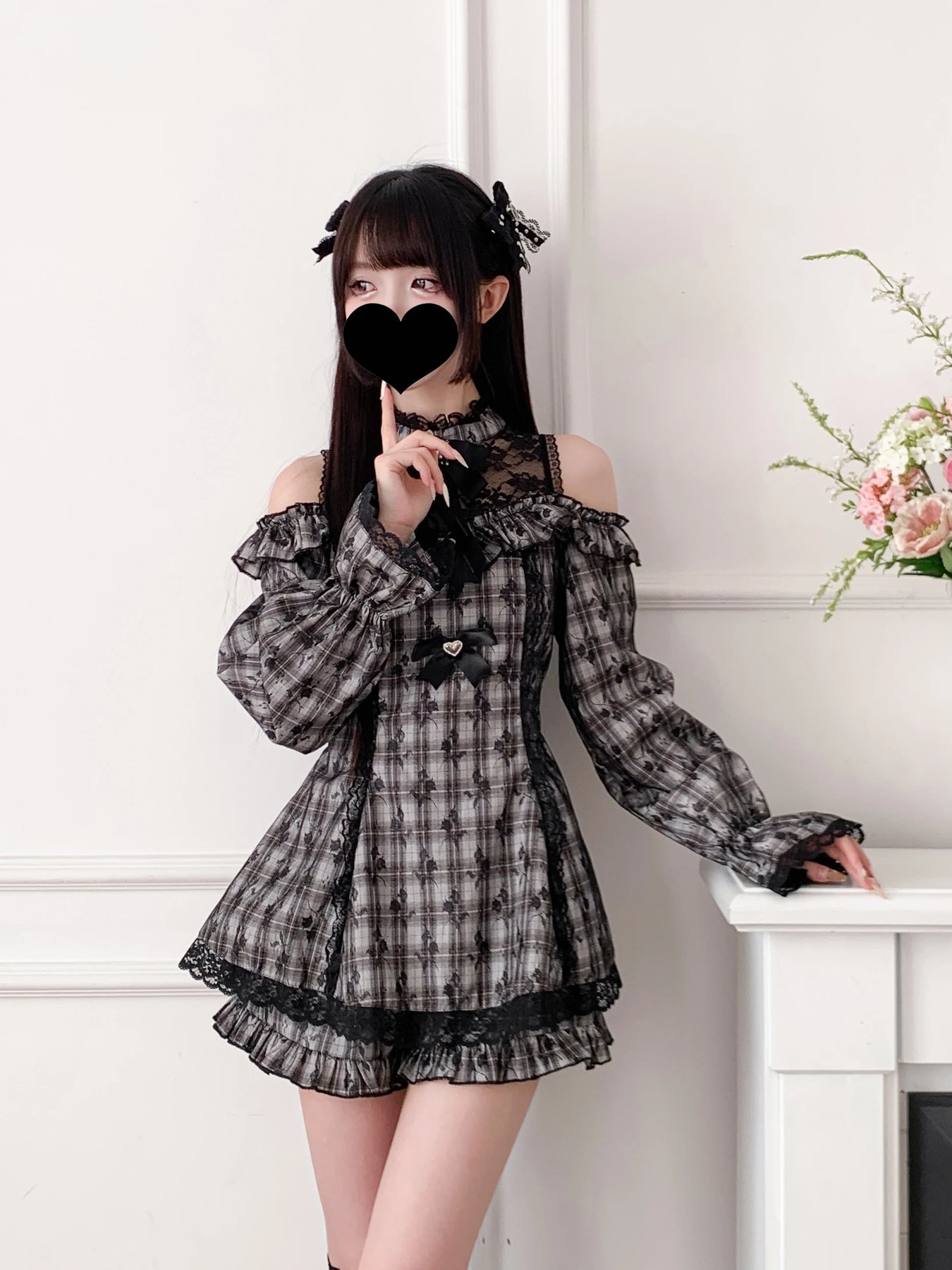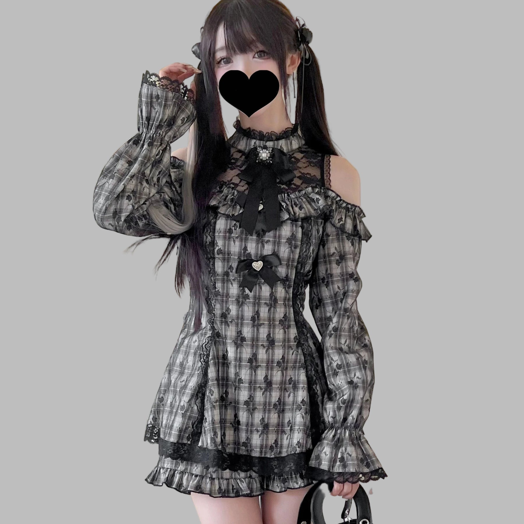 Vestido Jirai Kei Cinzento de Ombros Descobertos com Renda e Padrão Xadrez
