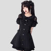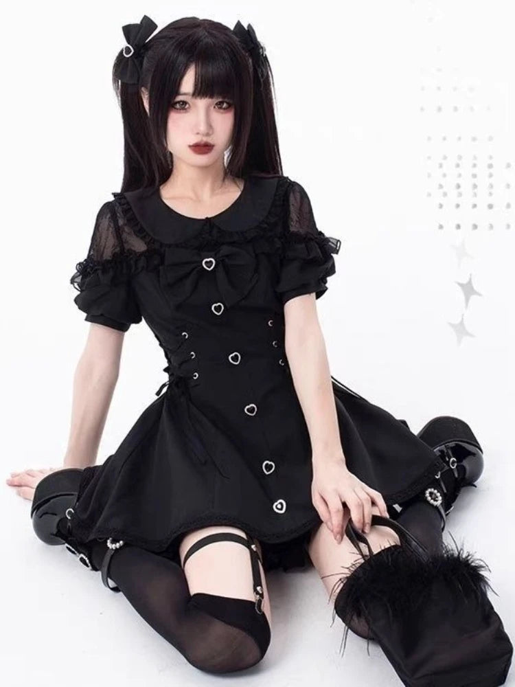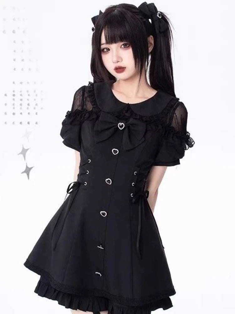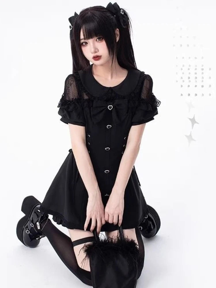 Vestido Jirai Kei Preto com Botões em Forma de Coração e Babados