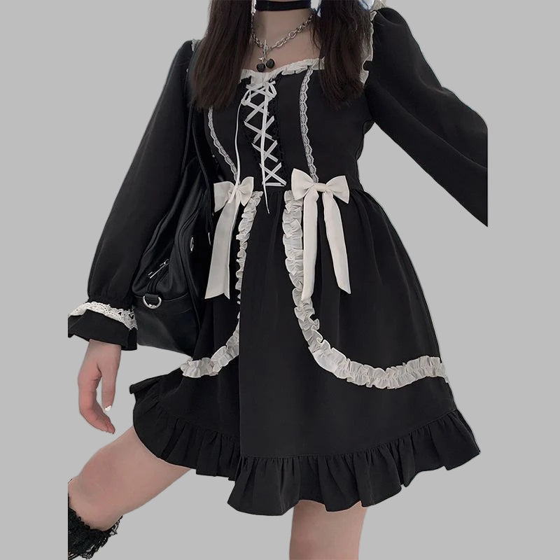Vestido Jirai Kei Preto com Laços Brancos e Cordões