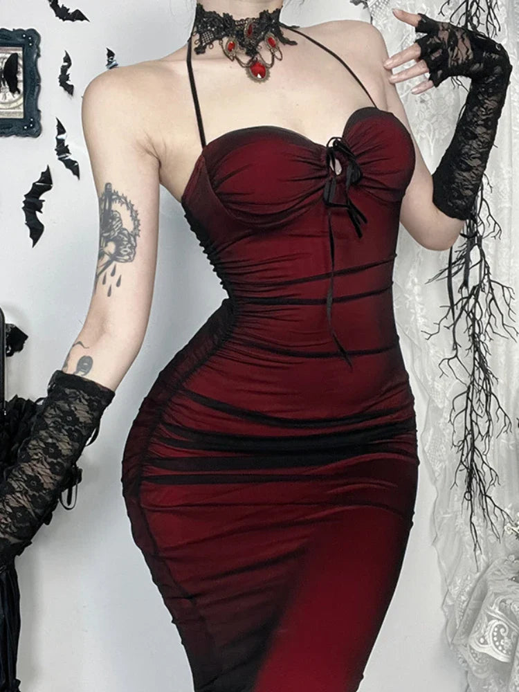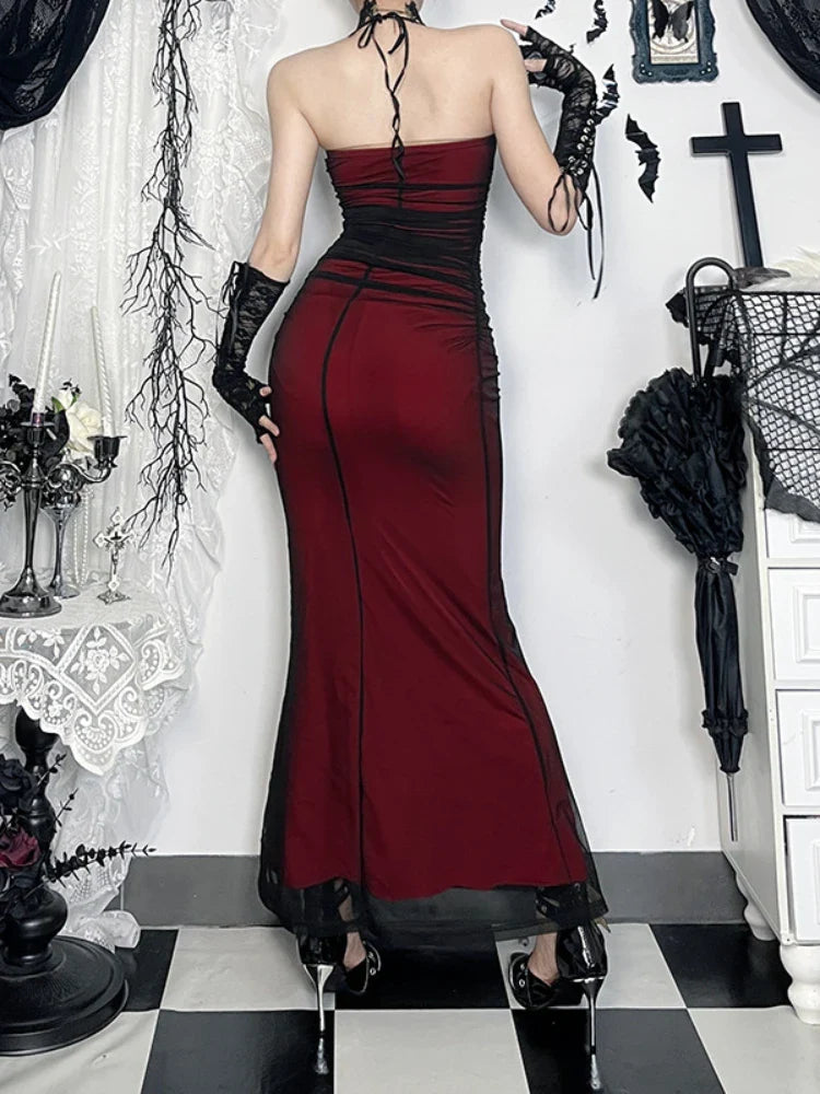 Vestido longo gótico bordô estilo sereia com racha e renda