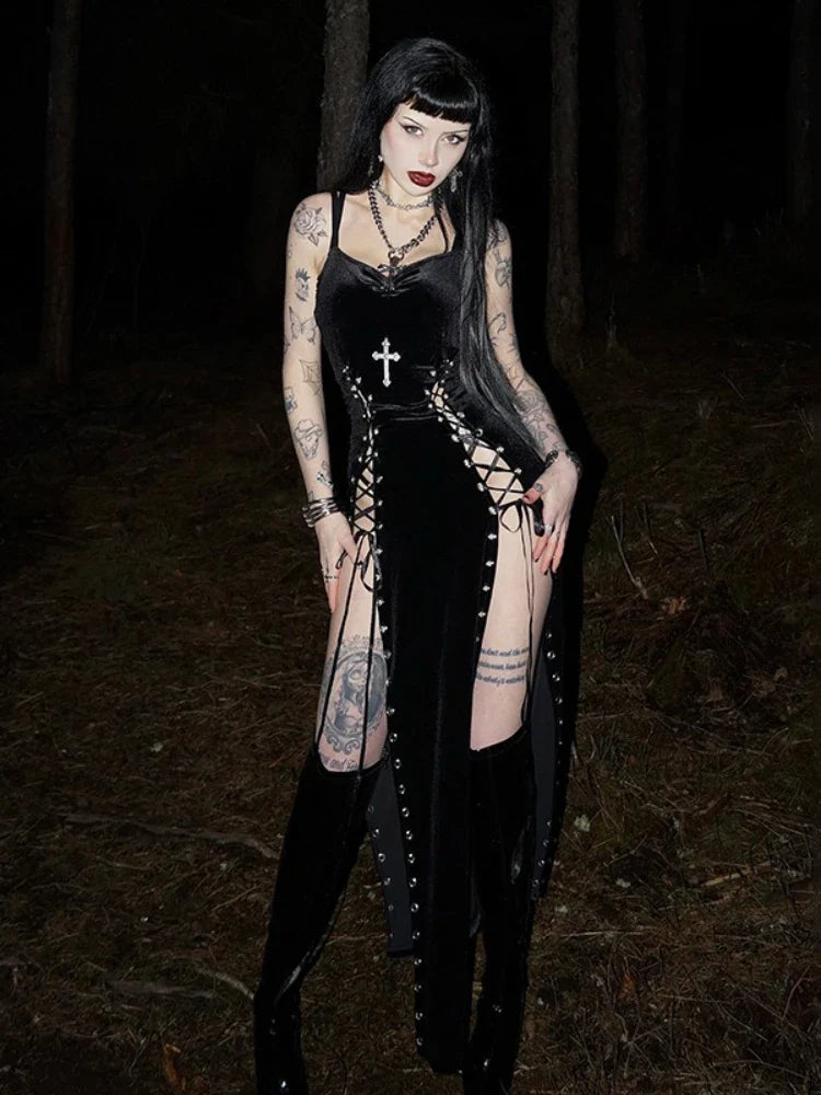 Vestido preto com racha em estilo grunge punk com cruz e rede