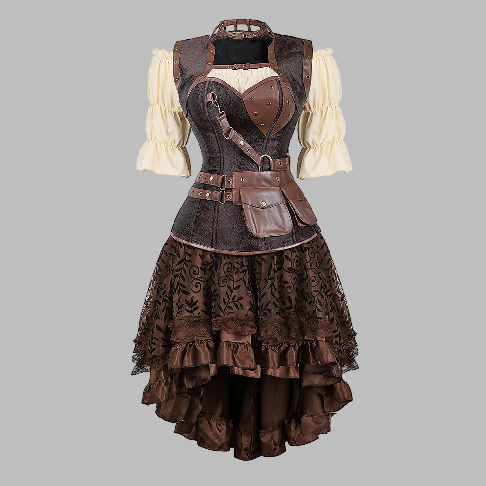 Vestido Steampunk Castanho com Corpete, Cintos e Bolsas
