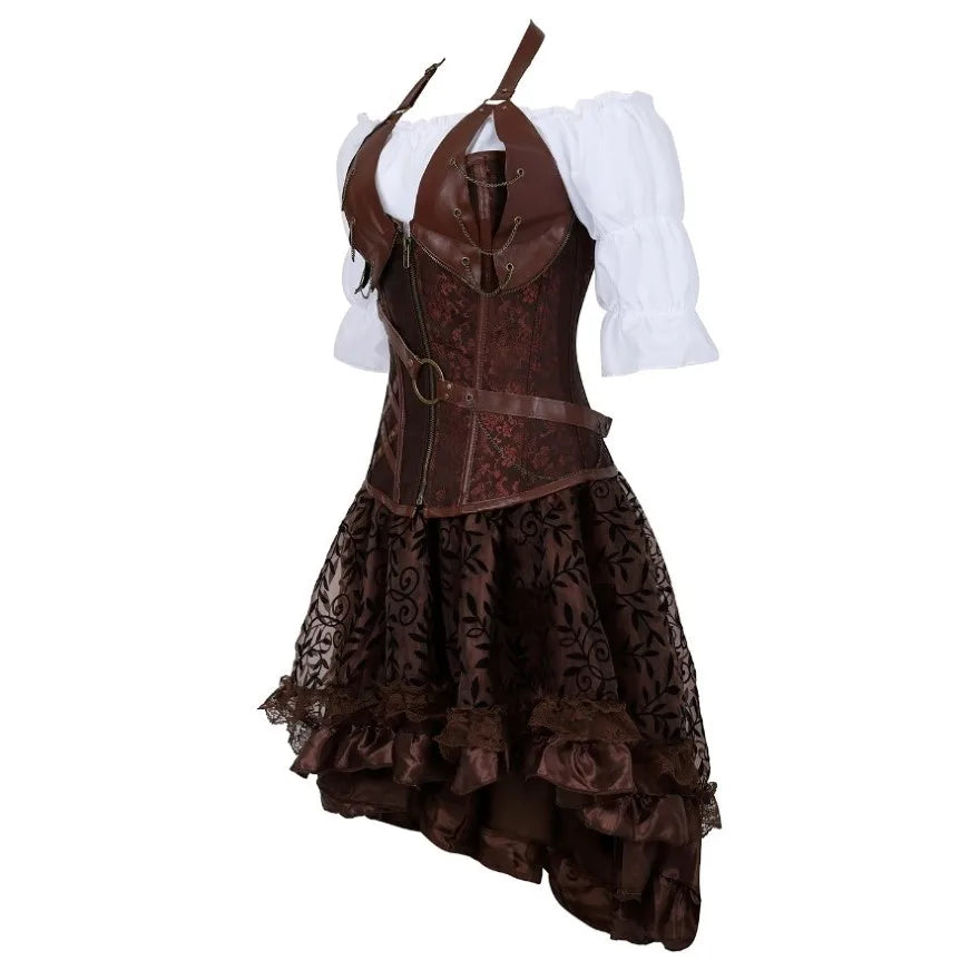 Vestido Steampunk Castanho com Corpete e Mangas Brancas Ver opcoes
