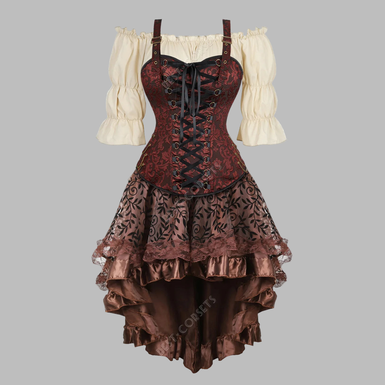 Vestido Steampunk com Corpete Bordô com Cordões e Renda