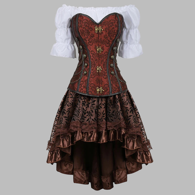Vestido Steampunk com Corpete Vermelho e Saia com Folhos